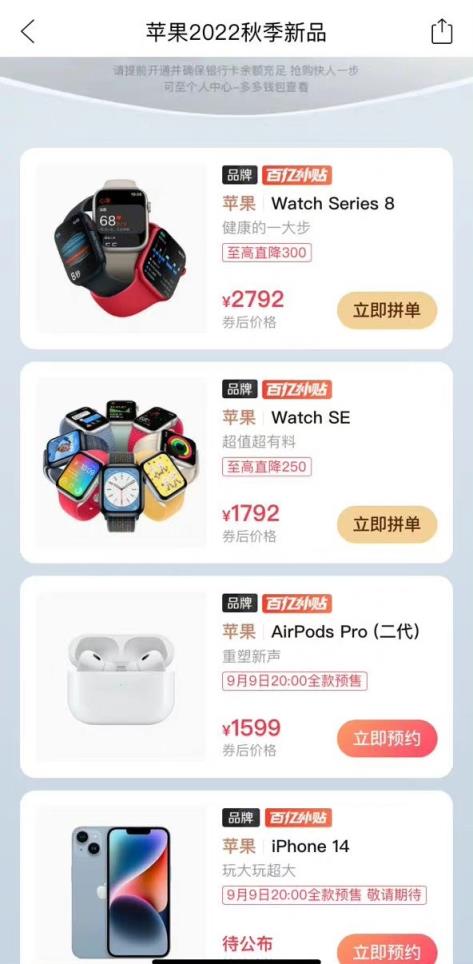 根据网友晒出的拼多多百亿补贴苹果新品专区,Apple Watch S8系列只要2792元起(官网2999元),Apple Watch SE2只要1792元起(官网1999元)。