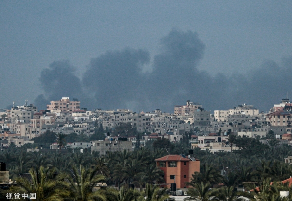 当地时间2024年4月27日,加沙地带,以色列轰炸了努赛赖特难民营,浓烟滚滚。